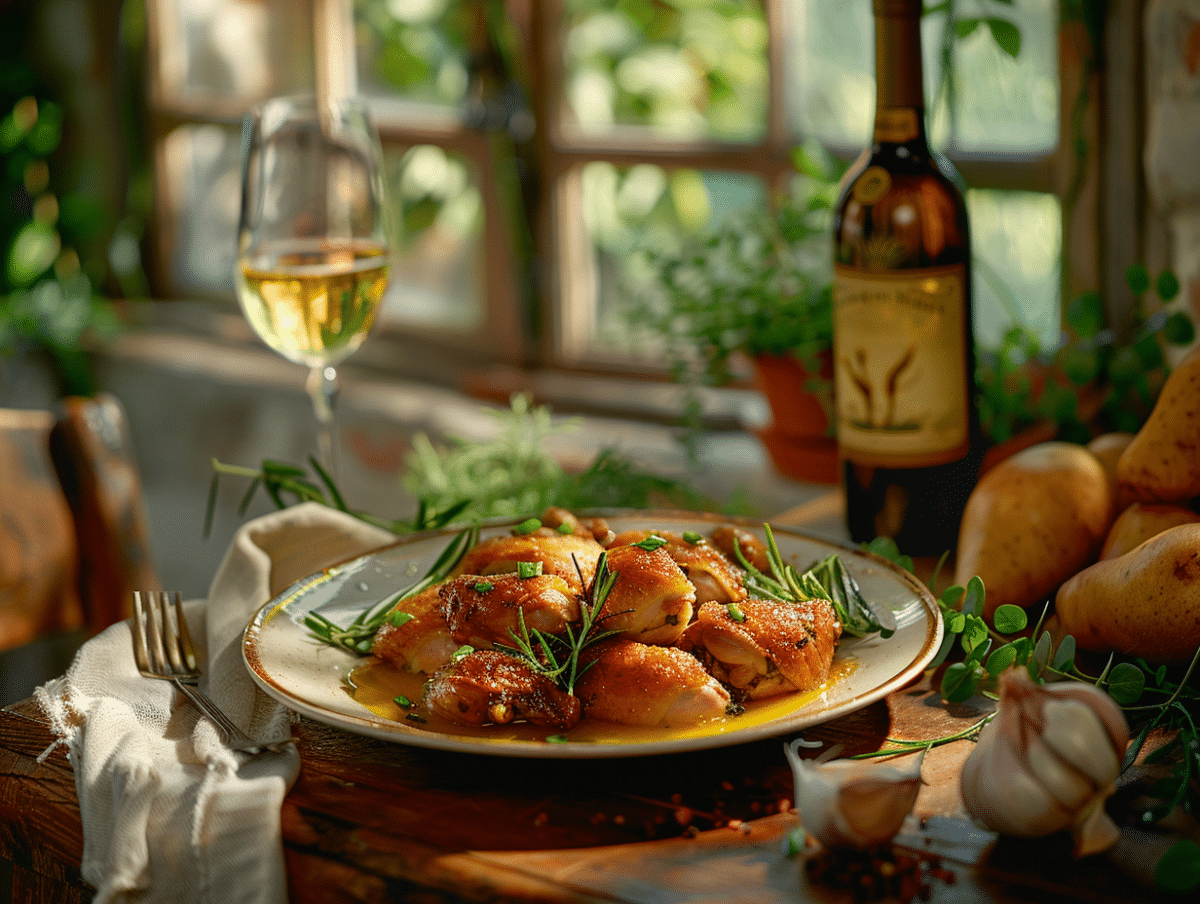 Pour un coq au vin jaune, les alternatives peuvent inclure des vins comme le Chablis, qui avec sa minéralité et ses notes d’agrumes, apporte une fraîcheur bienvenue pour équilibrer la richesse du plat. Le Banyuls, vin doux naturel du Roussillon, peut aussi offrir une dimension sucrée-salée intéressante, surtout si le plat est accompagné d’une sauce légèrement caramélisée.